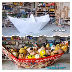 Als Teil des Projekts „100 Boote – 100 Millionen Menschen“ bauten unsere fleißigen Schülerinnen und Schüler der drei Internationalen Förderklassen (IFK) in den vergangenen Wochen gemeinsam mit dem Düsseldorfer Künstler Jacques Tilly ein Boot, das innerhalb einer größeren Ausstellung zum Weltflüchtlingstag am 20. Juni 2024 im Berliner Lustgarten der Öffentlichkeit präsentiert werden soll.