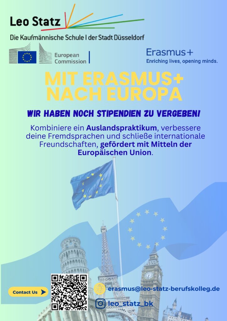 Das Leo-Statz-Berufskolleg ermöglicht 𝐝𝐢𝐫 ein Praktikum im Ausland zu absolvieren, gefördert von der Europäischen Union. Die Förderung umfasst die An- und Abreise sowie den eigentlichen Aufenthalt im Ausland.