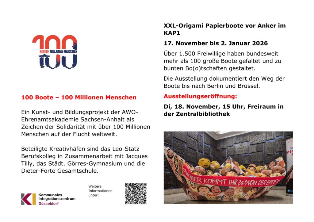 Eine abschließende Ausstellung der XXL-Origami-Papierboote zur Aktion „100 Boote – 100 Millionen Menschen“ beginnt am 17.11.2025 (bis einschließlich 02.01.2026) am KAP1.