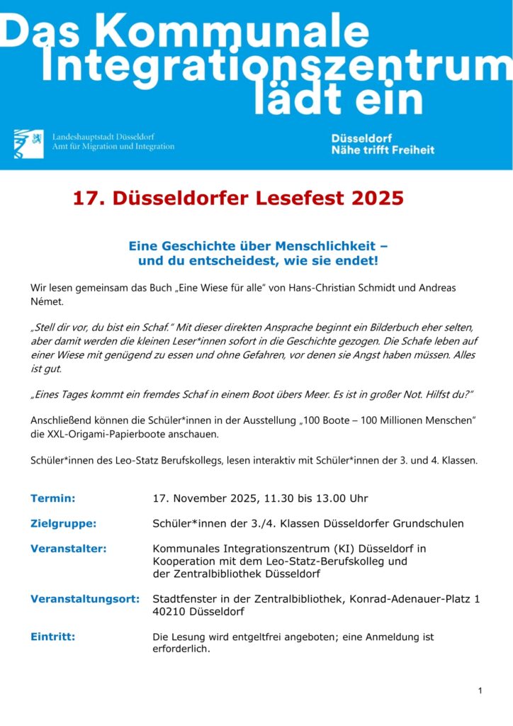 Außerdem finden begleitend zur Ausstellung am Düsseldorfer Lesefest (17.11.2025 zwischen 11:30 und 13:00 Uhr) gemeinsame Lesungen unserer HI1- und HS4-Schülerinnen und Schülern für interessierte Grundschülerinnen und -schüler der Klassen 3 und 4 statt.